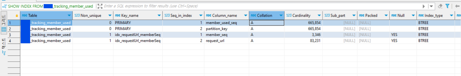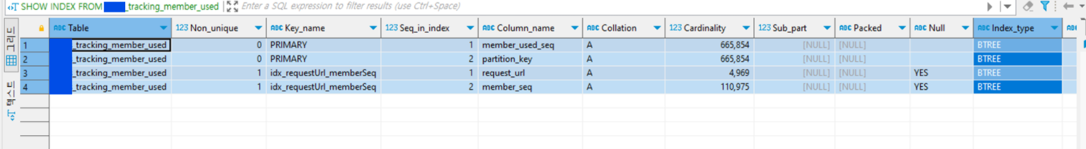 다음은 DBeaver에서 인덱스 정보를 보여주는 SHOW INDEX 명령어 결과를 캡처한 화면이다.